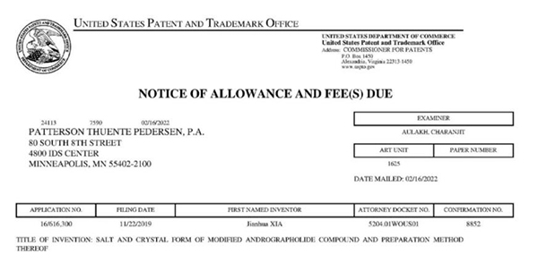 日前,珍寶島藥業(yè)收到美國專利局頒布的名為《一種穿心蓮內(nèi)酯改構化合物的鹽型、晶型及其制備方法》發(fā)明專利授權通知書。其專利申請?zhí)枮?/span>US 16/616,300,專利權期限為申請之日起20年。