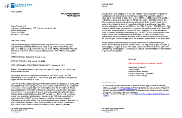 3月16日,珍寶島藥業(yè)發(fā)布公告,公司化藥仿制藥枸櫞酸托法替布片(規(guī)格:5mg)獲得美國(guó)食品藥物管理局(以下簡(jiǎn)稱“FDA”)下發(fā)的《受理通知書(shū)》,待取得FDA注冊(cè)批件或上市許可批件后可進(jìn)行銷(xiāo)售。