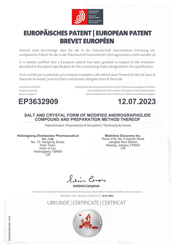 8月15日,珍寶島藥業(yè)發(fā)布公告。公司收到歐洲專利局頒發(fā)的內(nèi)容為《一種穿心蓮內(nèi)酯改構(gòu)化合物的鹽型、晶型及其制備方法》的專利授權(quán)證書。其國際專利申請?zhí)枮镻CT/CN2018/088168,專利權(quán)期限為申請之日起20年。