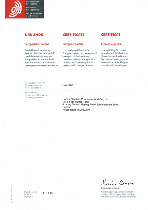 據(jù)珍寶島今日公告,黑龍江珍寶島藥業(yè)股份有限公司(以下簡稱“珍寶島”)子公司哈爾濱珍寶制藥有限公司(以下簡稱“哈珍寶”)收到美國專利局和歐洲專利局分別頒發(fā)的《專利授權(quán)證書》。