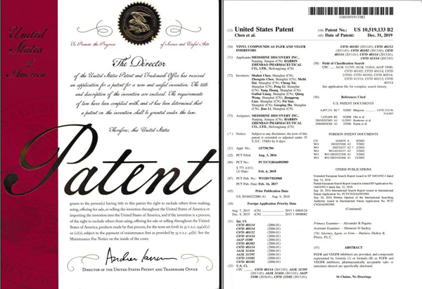 哈珍寶獲得的專利分別為:在歐洲獲得作為AKT抑制劑的二氫吡唑氮雜卓類化合物專利;在美國獲得作為FGFR和VEGFR抑制劑的乙烯基化合物專利。