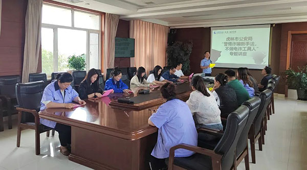 7月10日下午,虎林市公安局曙光派出所民警深入珍寶島藥業(yè)(虎林),開展電信網(wǎng)絡(luò)反詐騙宣講活動,公司人事行政總監(jiān)蘭培寶組織各部門員工第一時間到場聆聽宣講。